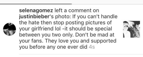 But then, in the midst of this drama, a new drama began. Selena Gomez waded into the comments section of one of Justin's photos to give the Biebz some advice. "If you can't handle the hate then stop posting pictures of your girlfriend lol -" she wrote. "It should be special between you two only. Don't be mad at your fans. They love and supported you before any one ever did."