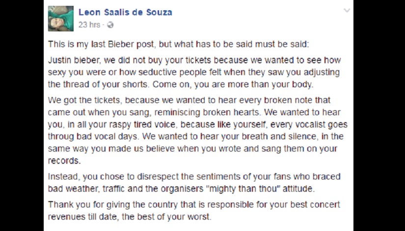"The box office ran out of paper and people had to wait for a whole hour till somebody finally realised that there was a show already running inside! Missed Alan Walker's set due to this, and the attitude of the Book My Show people at the box office didn't help either," de Souza wrote in a Facebook post, adding, "Justin Bieber, please don't do a show in India, like you were coming out of a shower and running late for a dress rehearsal. It is safe to say, that the show was an operational and a production nightmare, except for the fireworks bit and the feeling I got when I finally managed to sit in a cab two hours after the concert got over. And to think, we waited four months for this. Pathetic."