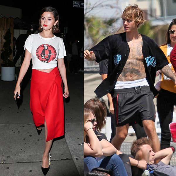 Justin Bieber was spotted shirtless at a soccer match with friends in Los Angeles on Saturday, while Selena Gomez was seen out on a night on the town.