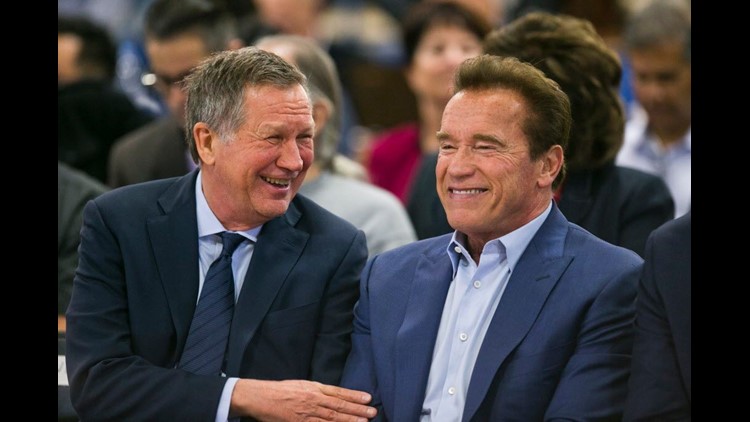 Former California governor Arnold Schwarzenegger, right, and Republican centrist Ohio Gov. John Kasich, appear at the first New Way California Summit, a political committee eager to reshape the state GOP, at the Hollenbeck Youth Center in Los Angeles March 21, 2018.
